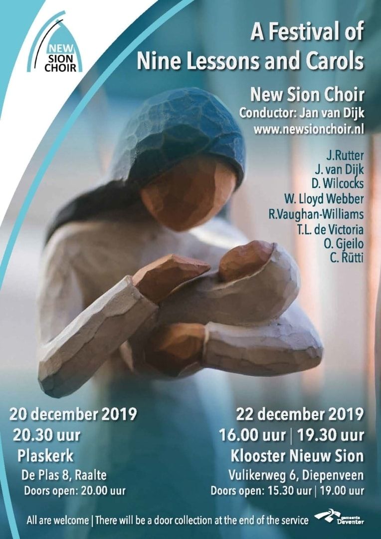 Het programma van A Festival of Nine Lessons and Carols bestaat uit een combinatie van koorzang, lezingen en samenzang. Vanwege overweldigende belangstelling vorig jaar, zijn er dit jaar drie edities: vrijdag 20 december om 20:30 uur in de Plaskerk in Raalte en zondag 22 december om 16:00 uur en 19:30 uur in Klooster Nieuw Sion in Diepenveen. De koorzang wordt verzorgd door het New Sion Choir onder leiding van dirigent Jan van Dijk en met begeleiding van organist Adriaan Koops. Naast bekende kerstliederen staan werken van onder andere Rutter, Gjeilo, de Victoria en Vaughan-Williams op het programma.