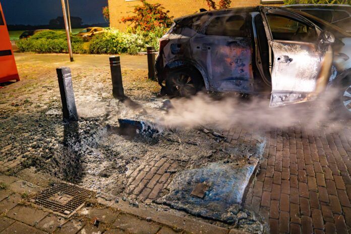 De schade aan de auto is zo groot dat deze total loss is verklaard. Om het vuur te kunnen blussen, moest de brandweer de achterbak openbreken.