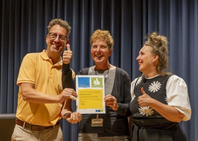 Wietse de Boer, directeur van Deventer Doet, overhandigde namens de Vereniging Nederlandse Organisaties Vrijwilligerswerk (NOV) het certificaat aan directeur Alice van Diepen en Judith Tool.