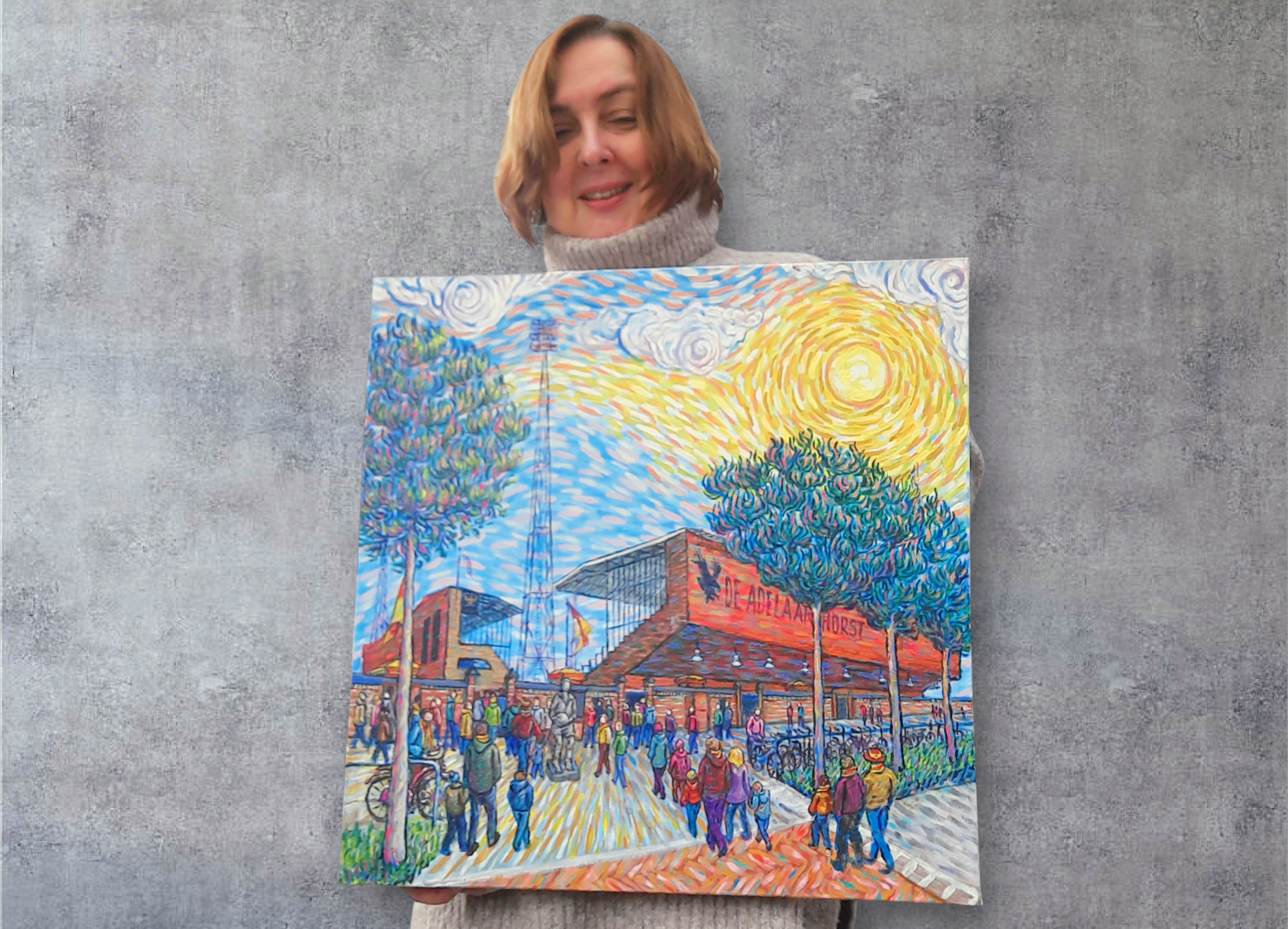 “Doordat het midden in de wijk ligt, betekent het veel meer voor fans en buurtbewoners. In mijn werken voor de serie ‘Als Van Gogh’ wil ik altijd een gevoel van diepe verbondenheid overbrengen. Er zijn weinig locaties denkbaar waarbij dat gevoel van nature zo sterk aanwezig is als bij De Adelaarshorst”, aldus de kunstenaar.