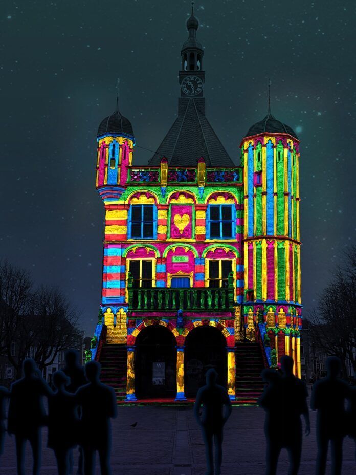 Geprojecteerde kleurplaten op de Waag of Stadhuis