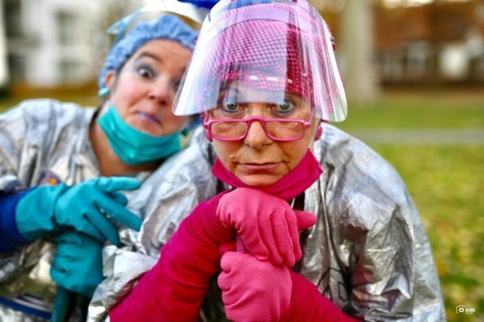 De beide ietwat vreemd uitgedoste dames, helemaal ingepakt in speciale veiligheidskleding rijden kris kras in hun pick-up door het dorp en onderzoeken of iedereen zich wel aan de regels houdt. Bijvoorbeeld: zetten kinderen wel handgel bij hun schoen en zorgen ze voor een getapete route door hun huis? Kan Piet wel veilig naar binnen?