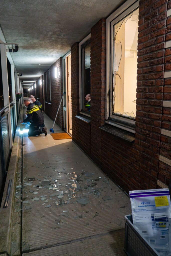 De politie gaat uit van opzet. Volgens een woordvoerder gaat het mogelijk om een explosief of zwaar vuurwerk, dat vanaf de galerij bij het raam is afgegaan. Ook de brandweer werd ingeschakeld, om in de woning te meten of er geen sprake was van een verhoogde concentratie aan gevaarlijke stoffen of rook. Dit bleek niet zo te zijn. Een explosievenexpert van de politie heeft samen met de Forensische Opsporingsdienst onderzoek gedaan. Het is nog niet bekend welk exposief precies is gebruikt. Foto’s Rens Hulman