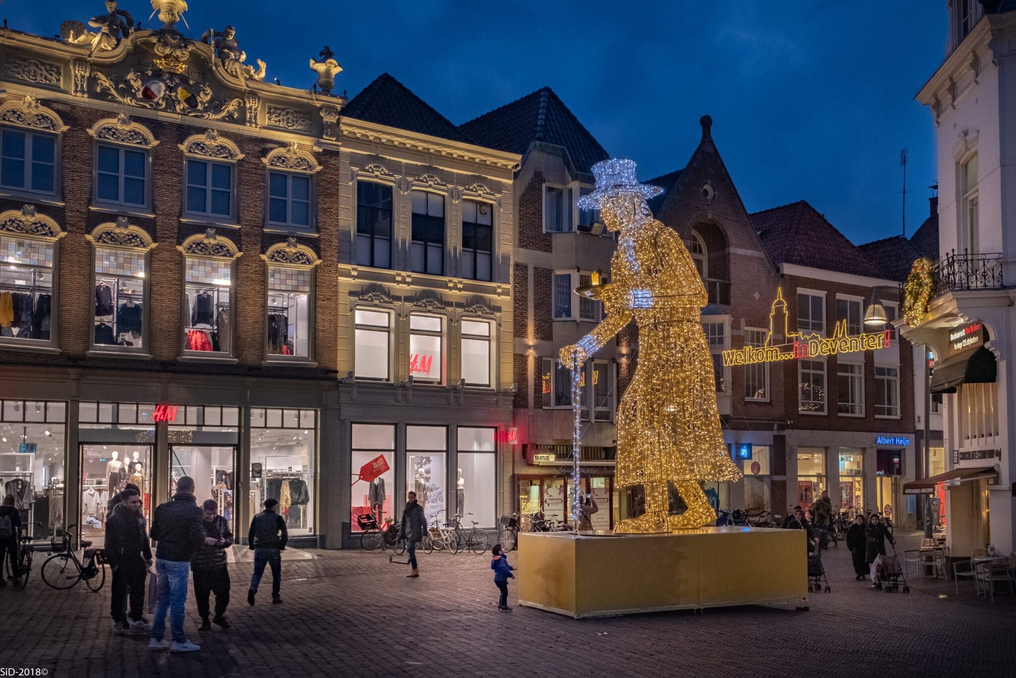 Start: Verlichte Scrooge op kruising Walstraat/ Korte Bisschopstraat/Brink.