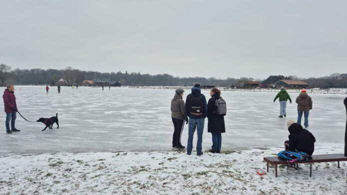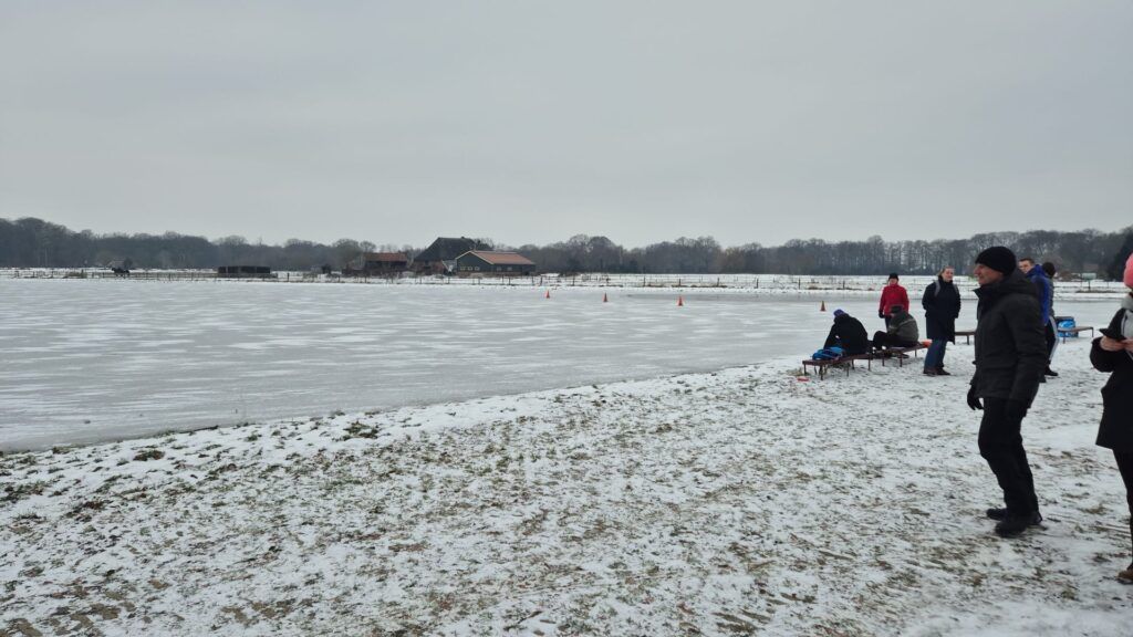 De tamtam ging rond in het dorp. ‘It giet deur!’ werd er naar meerdere groepsapps gestuurd. Pascal Berends is bestuurslid en ging zondagochtend poolshoogte nemen bij de baan. “Tijdens een controleronde zakte ik wel door het ijs, maar dat is nu alweer dichtgevroren. Er ligt nu een laag van 7 à 8 centimeter, dat is dik genoeg.” Door de sneeuw is het ijs niet helemaal glad. “Dat is jammer, maar als we nu niet opengaan, kan het misschien lange tijd niet meer,” zegt Pascal.
