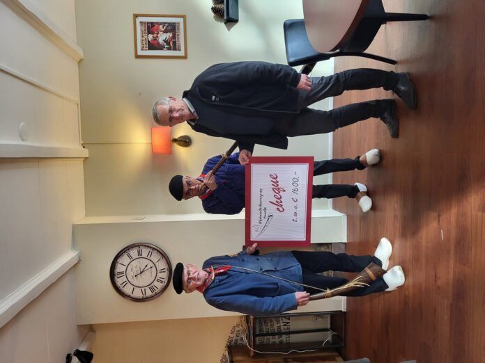 In eetcafé Bij9en werd afgelopen vrijdag de cheque uitgereikt door Gerrit Lindeboom en Harry Soeteman van de Midwinterhoornblazers uit Haarle. Trots poseerden de heren in tenue. Voorzitter van De Strijd van Salland, Paul Kortekaas nam de cheque dankbaar in ontvangst. “Wat een fantastisch bedrag!” riep hij uit. Het is een van de vele acties voor het initiatief dat nu al zo’n 8 jaar geld inzamelt ten bate van hersentumor onderzoek.