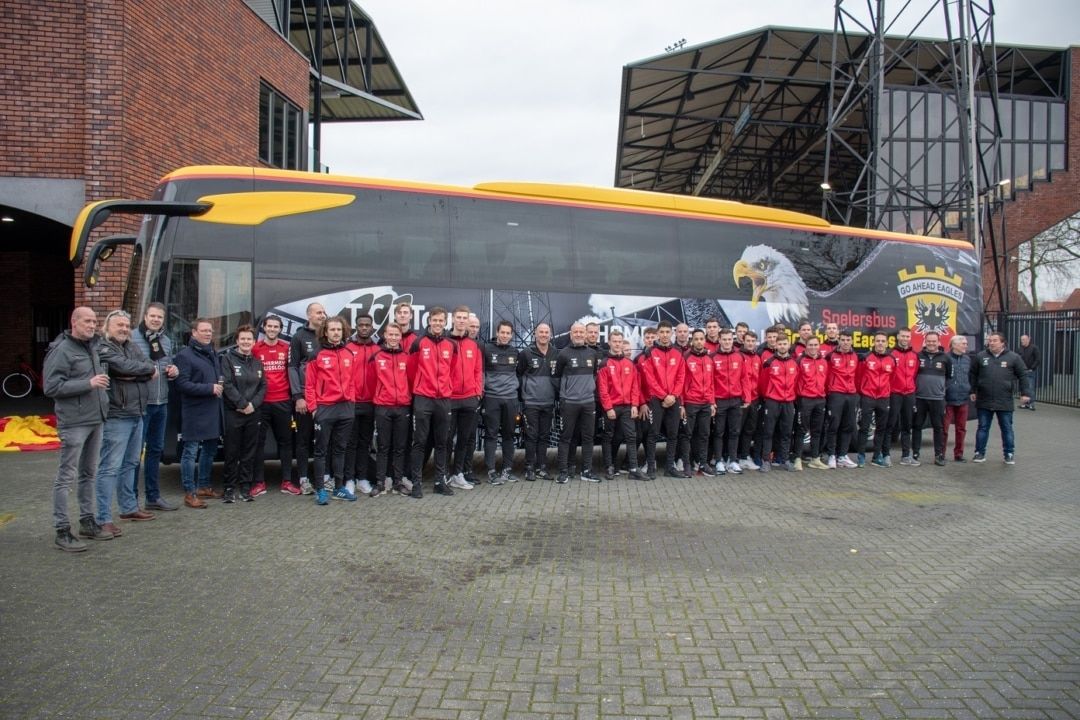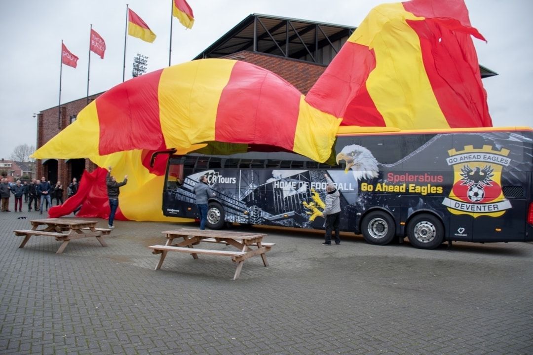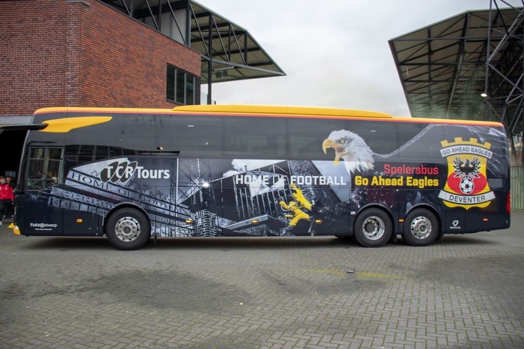 De afgelopen weken heeft TCR Tours uit Raalte, vervoerspartner van Go Ahead Eagles, ziel en zaligheid gestoken in de realisatie van de nieuwe spelersbus, die rondom voorzien is van verrassende bestickering. Afgelopen zondag namen spelers en staf van Go Ahead Eagles de spelersbus voor het eerst officieel in gebruik tijdens de uitwedstrijd tegen FC Den Bosch (2-3 zege).