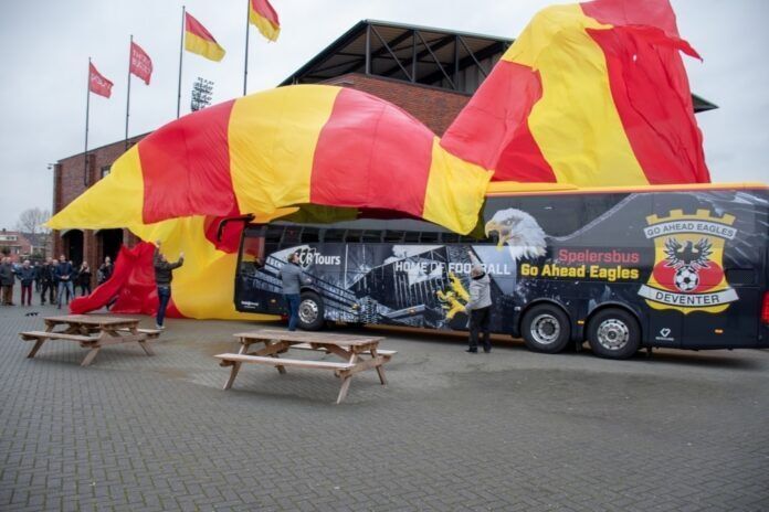 In het bijzijn van selectiespelers, staf, supporters en Business Partners van Go Ahead Eagles werd afgelopen vrijdag de nieuwe spelersbus van de club onthuld op het supportersplein van De Adelaarshorst in Deventer. Nadat de bus was ontdaan van het metersgrote spandoek waarin het was gewikkeld, konden alle genodigden de rood-gele aanwinst in volle glorie bewonderen.