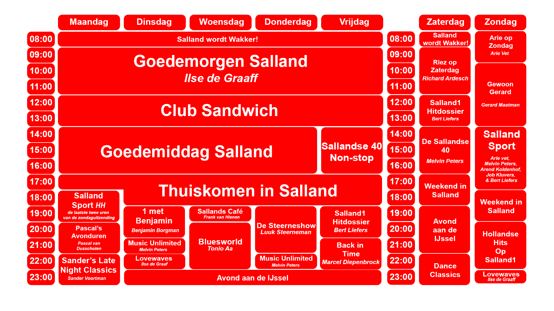 met Melvin Peters14:00 tot 16:59[ tot ]Dè Sallandse zaterdagmiddag gebeurtenis met de meest betrouwbare en objectieve hitlijst van Salland mede Samengesteld door onze luisteraars – Stem wekelijks op je favoriete hits!