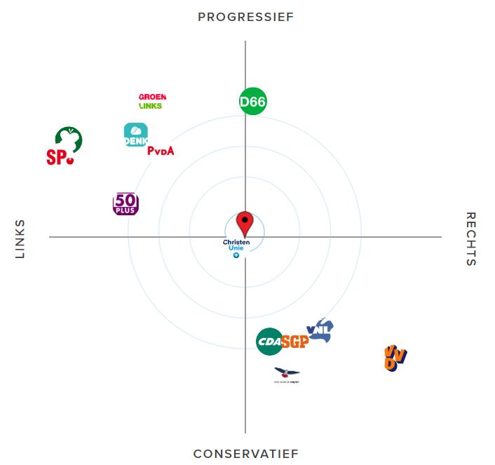 Verder vind je nog veel andere thema’s terug in de kieswijzer, zoals woningbouw, aanpak van stikstof, het eigen risico in de zorg en de oorlog in Gaza. Nadat je de 30 stellingen hebt beantwoord, krijg je een grafiek met progressief, conservatief, links en rechts. Maar ook welke partijen het dichtst bij je liggen.