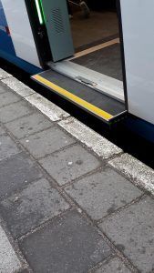 Nu heeft Sanne een brug nodig. Maar je komt in Raalte de trein ook met een ‘gewone’ rolstoel niet meer in sinds Keolis het vervoer op die lijn regelt. En met het rollator is dat ook nog niet zo maar gedaan. “Keolis vindt dat je zelfstandig in- en uit moet kunnen stappen. Ze hebben een uitschuifbare plaat bij de deuren, die moet mooi aansluiten op de perronrand zodat je zo binnen kunt rollen. Maar… helaas kan dat in Raalte niet. Er is een hoogteverschil tussen perron en die plaat zodat je een stukje naar beneden schiet met je rolstoel of rollator. Dus kun je alsnog niet zelf de trein in.”