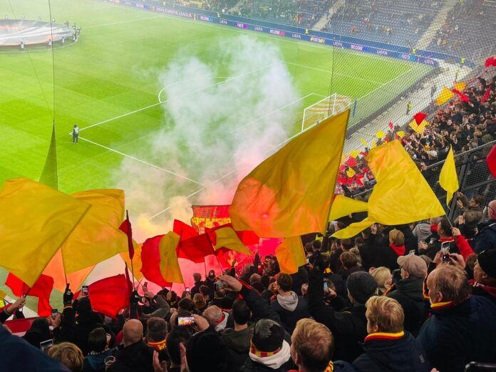 De ploeg van Melvin Boel speelde in het speciale Europa League-tenue in wit met groen. In de avond werd het snel kouder, waardoor zowel spelers als supporters wolkjes lucht uitbliezen.