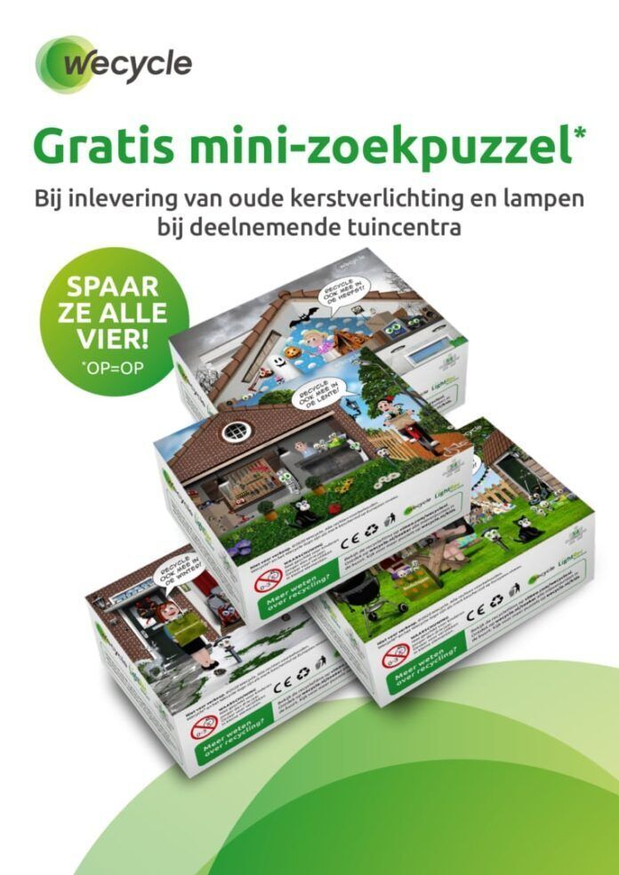 Bij inlevering van oude (kerst)lampen bij Boerenbond, Coppelmans, Groenrijk, Intratuin en Life & Garden ontvangen snelle inleveraars, zolang de voorraad strekt, een leuke mini zoekpuzzel. Er zijn vier verschillende zoekpuzzels. Bovendien maakt iedereen die een mini zoekpuzzel heeft ontvangen ook nog eens kans op een mooi kerstpakket door het recyclemysterie in de puzzel op te lossen. Maar wees er snel bij want *op=op! Meer informatie op wecycle.nl/consumenten.
