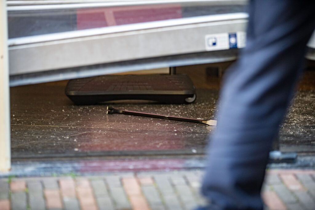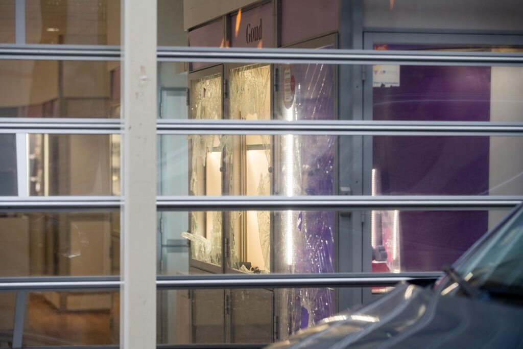 Een paar uur later ging plots het alarm af. Toen politie en beveiliging aankwamen, zagen ze meteen dat het mis was. Het rolluik was opengebroken en vitrines met goud en diamanten waren kapotgeslagen. Er bleek buit te zijn meegenomen.