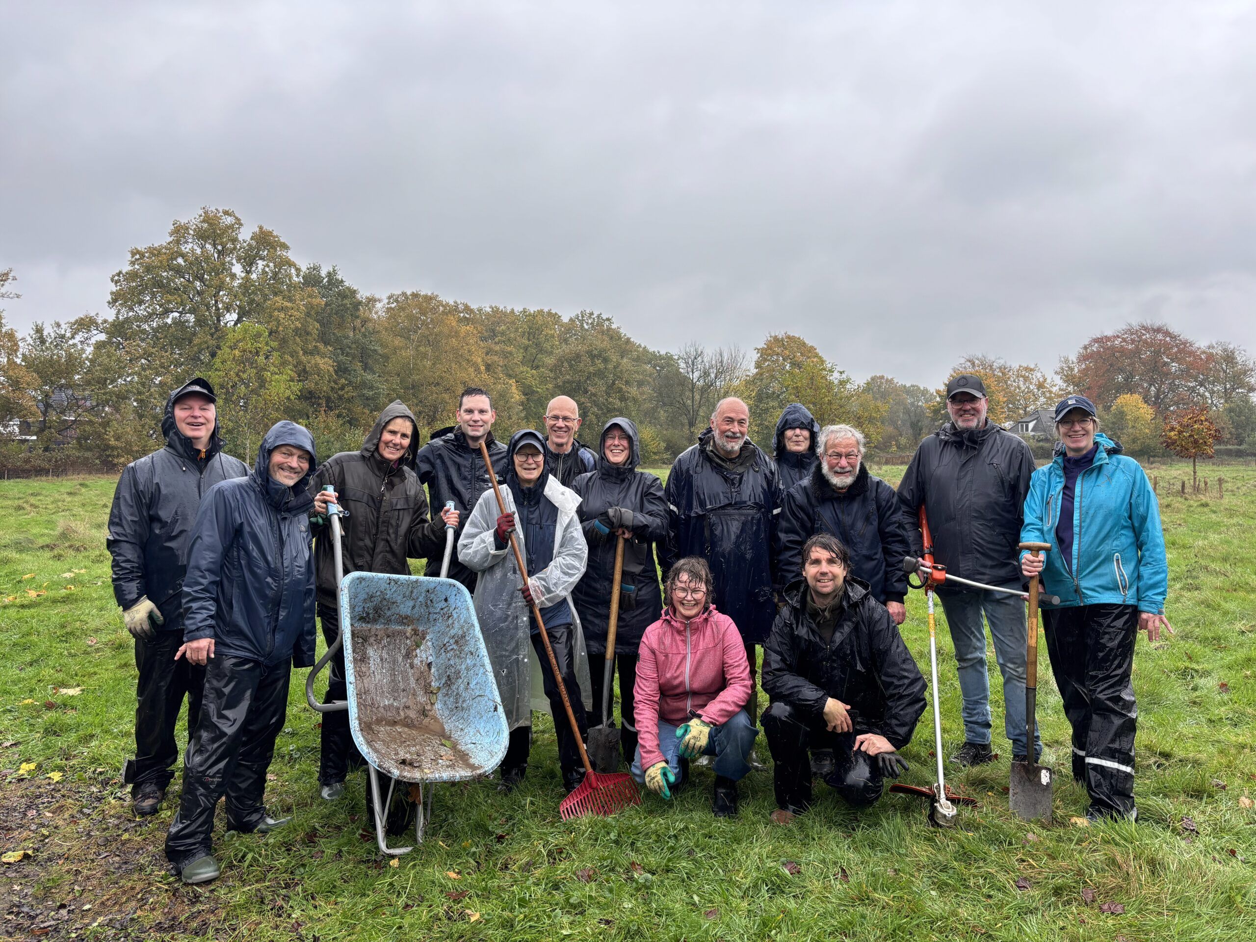 Gras, brandnetels en distels maaien en opkomende eikjes en bramen verwijderen: ondanks de harde regen steken de vrijwilligers van Landje van Niets deze zaterdagochtend de handen uit de mouwen tijdens de Landelijke Natuurwerkdag.